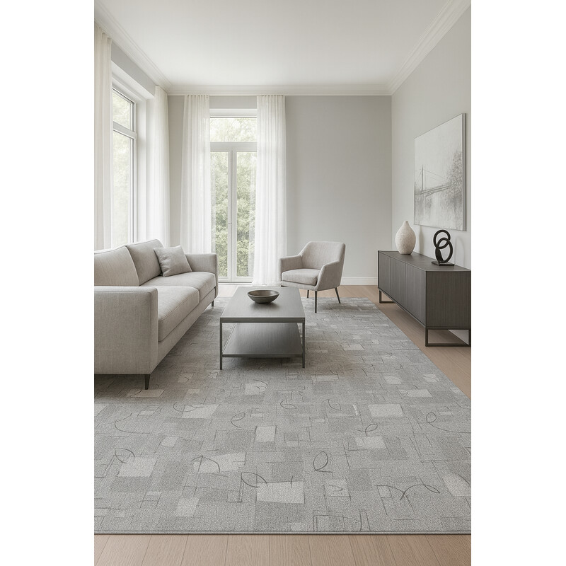 Tento koberec vyniká elegantními odstíny šedé a modré, které doplňuje jemný stříbrný vlas s decentním leskem. Po obvodu je lemován světlým pruhem bez vzoru, což vytváří čistý a moderní vzhled. Krátký vlas usnadňuje údržbu, takže je koberec praktický pro rodiny s dětmi nebo domácími mazlíčky. Směs materiálů zajišťuje jeho dlouhou životnost a příjemný povrch.