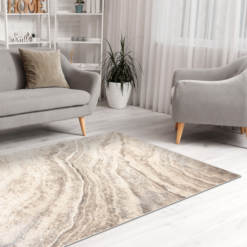 Koberec Fusion 9776 cream/beige na první pohled připomíná strukturu přírodního kamene nebo jemně zvlněné linie mramorové desky. Světlé tóny béžové a šedé se prolínají do decentního, ale velmi elegantního vzoru, který působí luxusně a nadčasově. Díky střiženému polypropylenovému vlasu je povrch měkký, pohodlný při chůzi a snadno se udržuje. Obšití po celém...