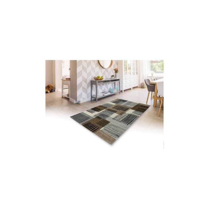 Hnědo-bílošedý kusový koberec s originálním geometrickým motivem, který skvěle zapadne do modernějšího obývacího pokoje či ložnice. Tento koberec disponuje nižším vlasem, takže se snadno čistí a udržuje. Potěší i antistatickou či antibakteriální úpravou nebo třeba vyšší pevností a odolností díky použití 100% polypropylenu typu frisé