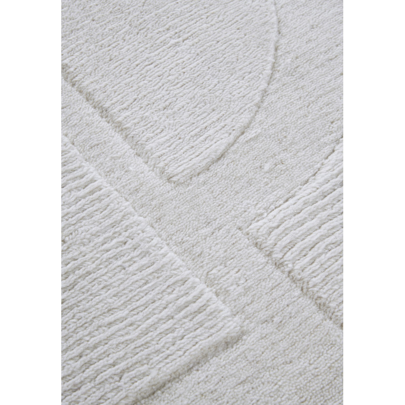 Krémově bílý koberec s geometrickým 3D vzorem je pravým ztělesněním elegance a moderního stylu. Jeho středně vysoký střižený vlas z vlny nejenže vyniká svou měkkostí, ale také skvěle izoluje chlad a je ideální pro podlahové vytápění. Pečlivé ruční tkaní a elegantní obšití po celém obvodu dodávají tomuto kousku luxusní vzhled a dlouhou životnost.