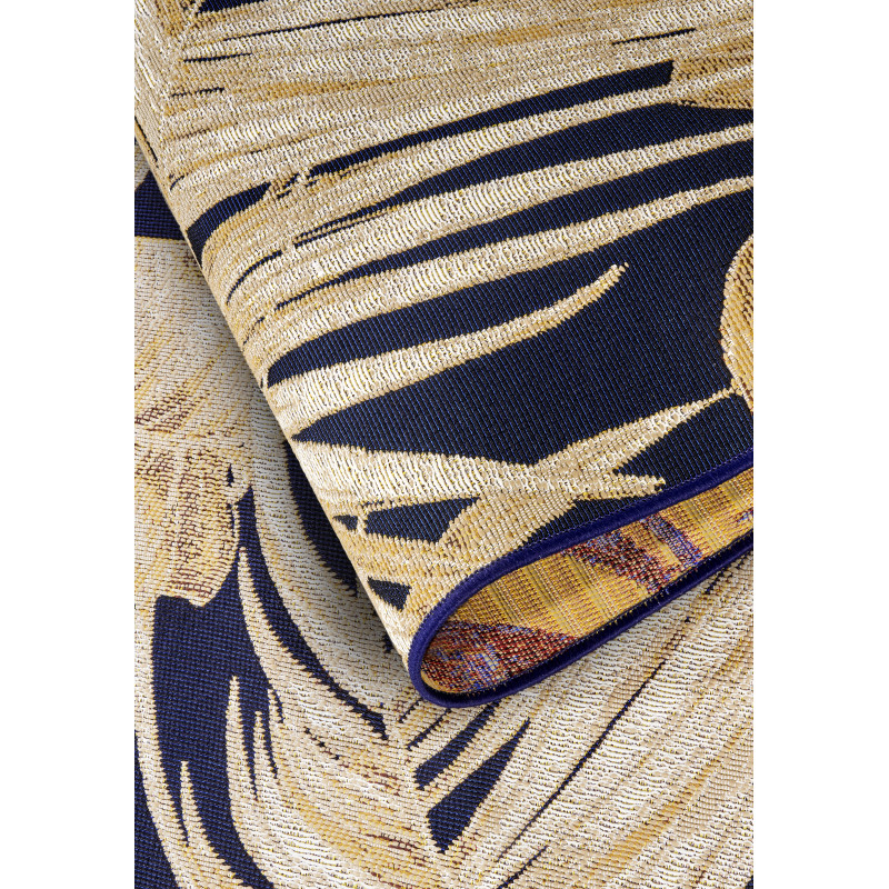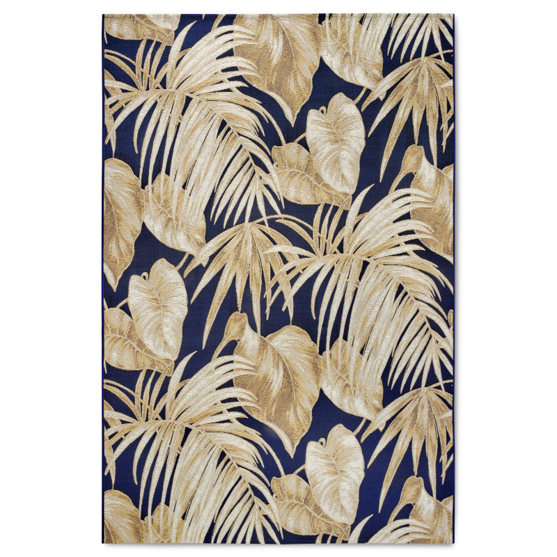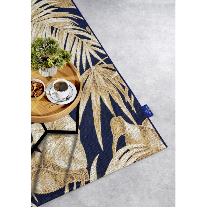 Tmavě modrý koberec se zlatými listy vytváří luxusní a sofistikovaný vzhled, který okamžitě upoutá pozornost. Jeho barevná kombinace dodá prostoru hloubku a eleganci. Díky spojení polyesteru a polypropylenu BCF je snadno udržovatelný a odolný, ideální i pro intenzivní používání v každodenním životě.