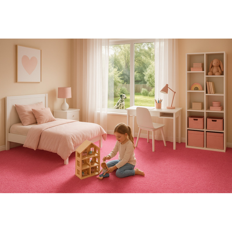 Nádherný metrážový koberec z kolekce Dynasty v dívčí růžové barvě. Tento bytový koberec se střiženým vlasem (saxon) má filcový podklad a hodí se na podlahové vytápění. Koberec je vhodný do středně namáhaných bytových prostor. Díky růžové barvě ho můžete použít jak do obývacího pokoje, tak třeba do dívčího pokojíčku.