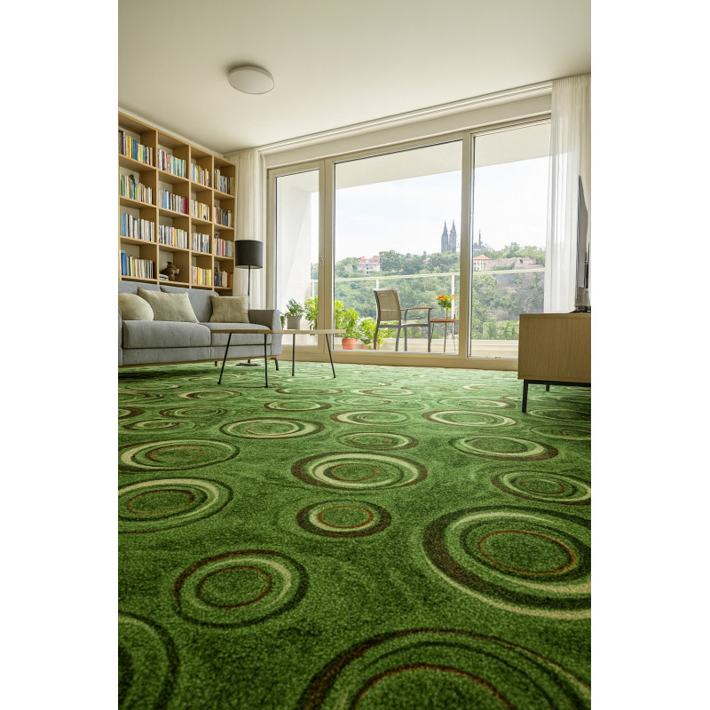 Originální zářivě zelená barva tohoto metrážového koberce Drops vnese do každé místnosti klid a pohodu. Koberec je vyrobený z polyamidu a cenově je velice dostupný. Hodí se především do středně namáhaných bytových prostor. Zdobený je barevným potiskem v podobě kruhů v zelených a hnědých odstínech.