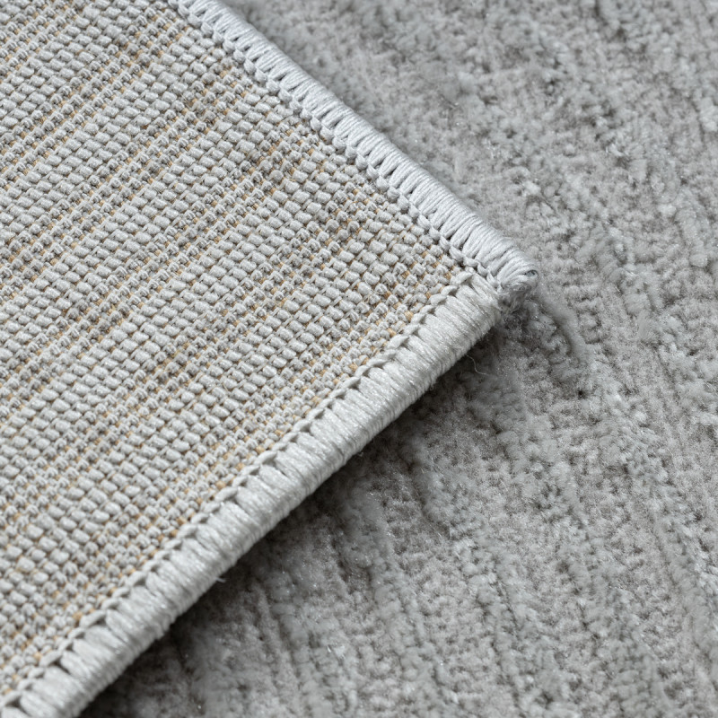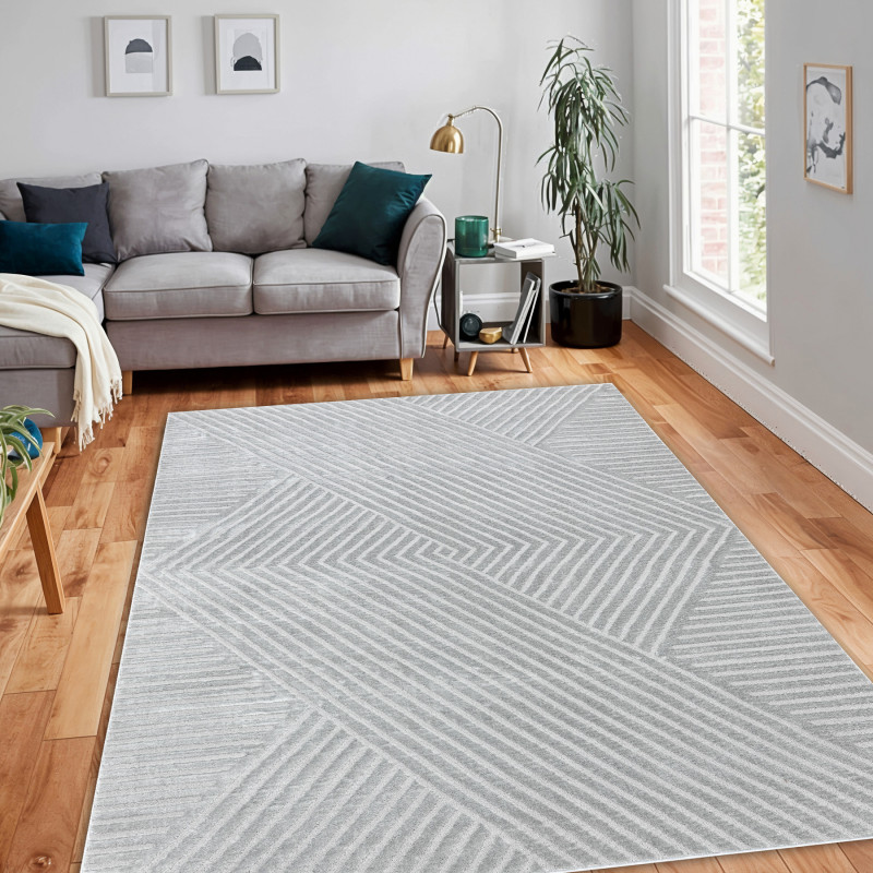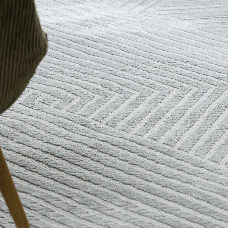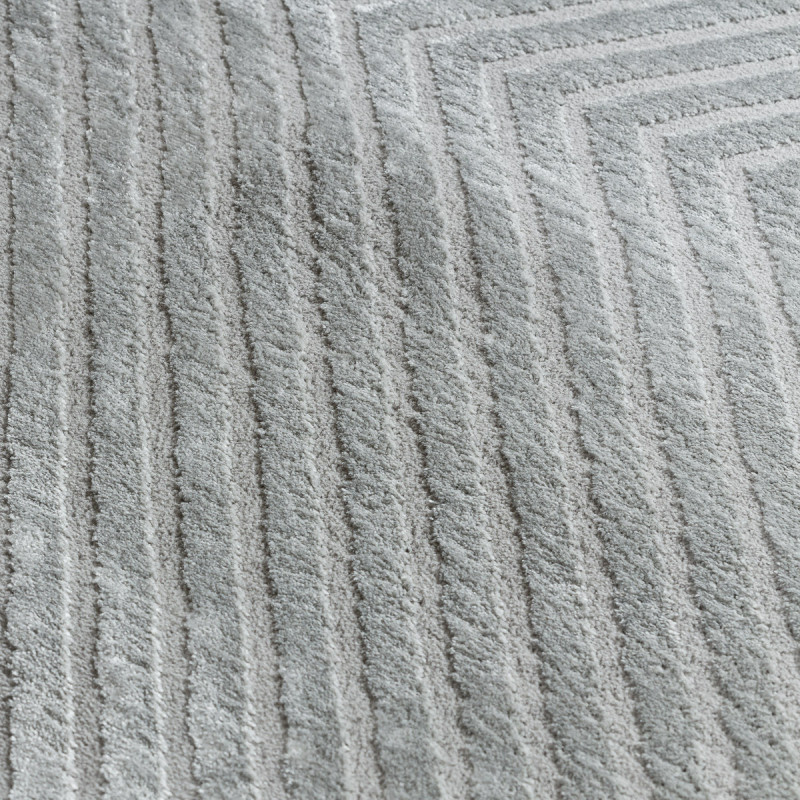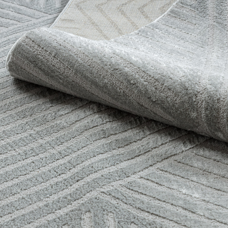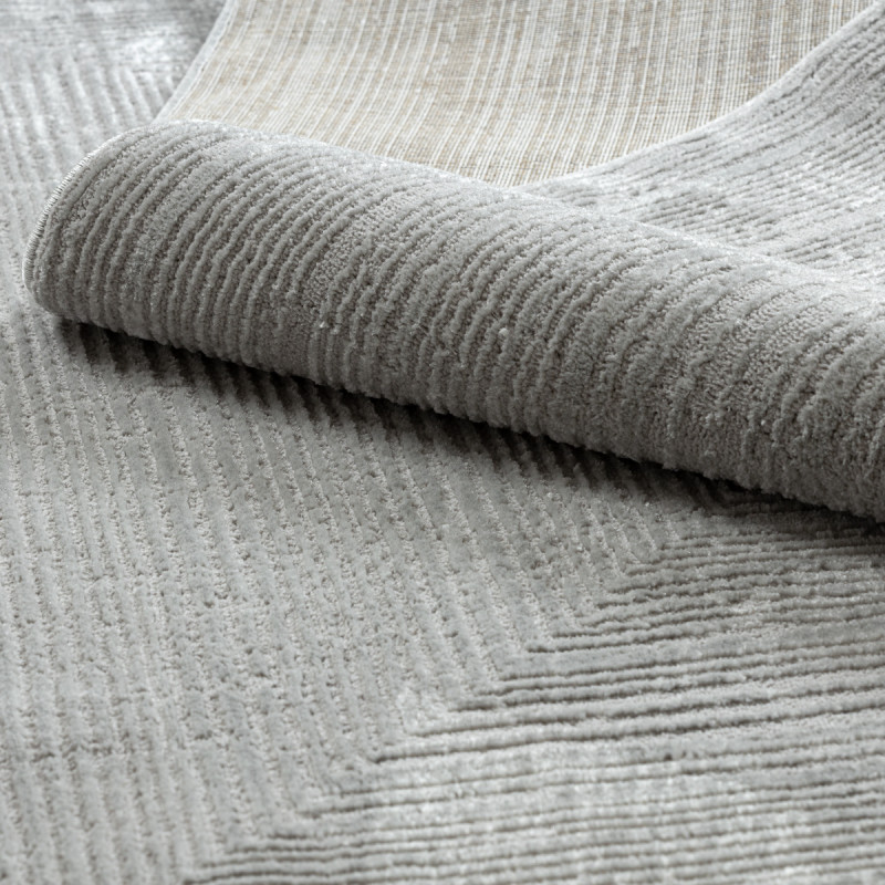Stříbrný koberec s geometrickým motivem Vás na první pohled zaujme plastickým vzorem, který vytváří různě dlouhá vlákna. Jedná se o kousek vyrobený ze 100% polypropylenu, což je standardní materiál na výrobu koberců, který se vyznačuje odolností a snadnou údržbou.