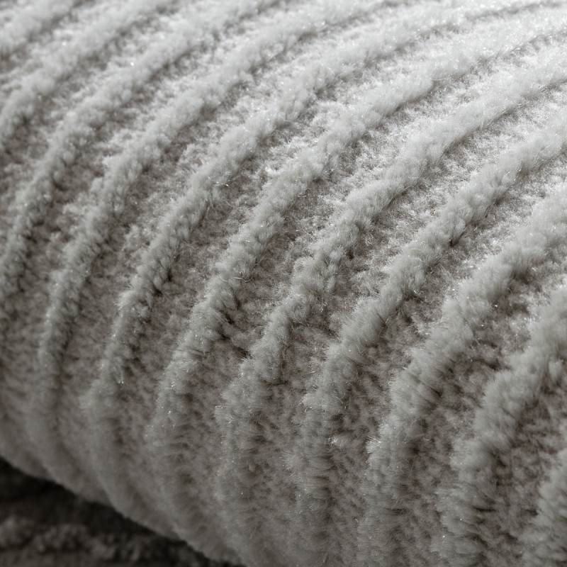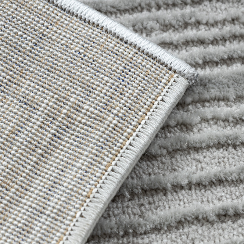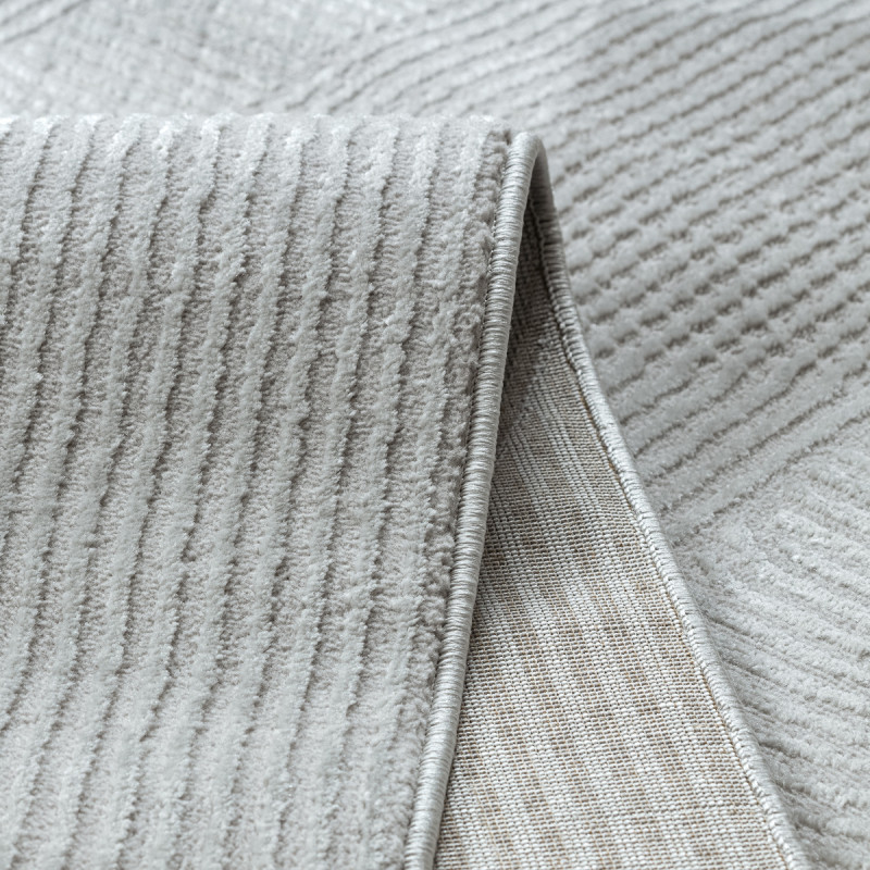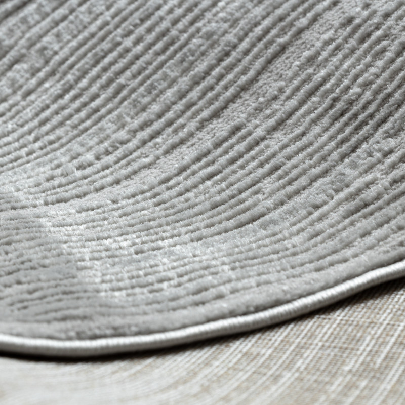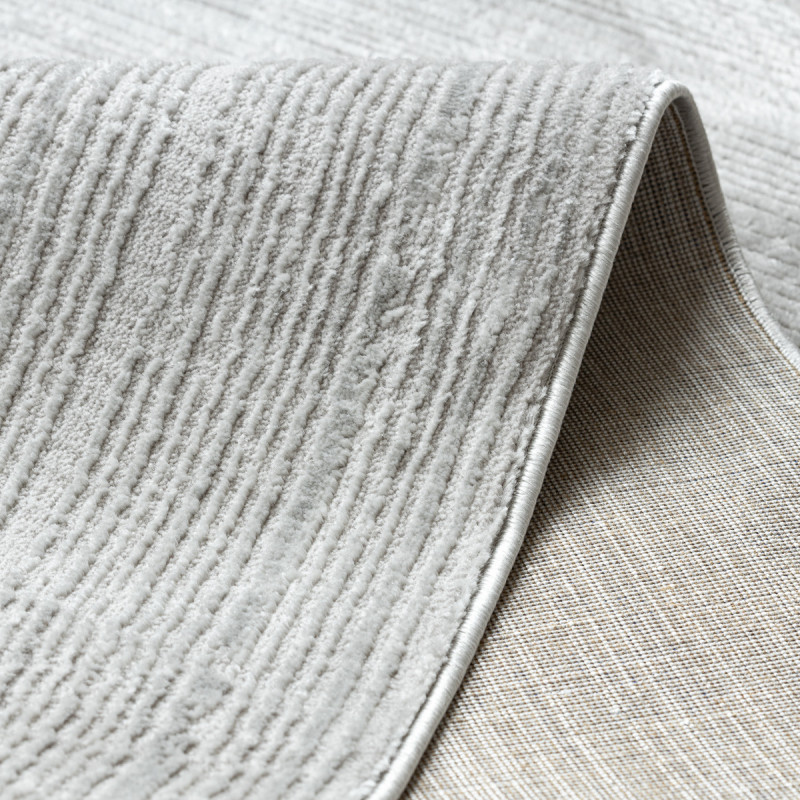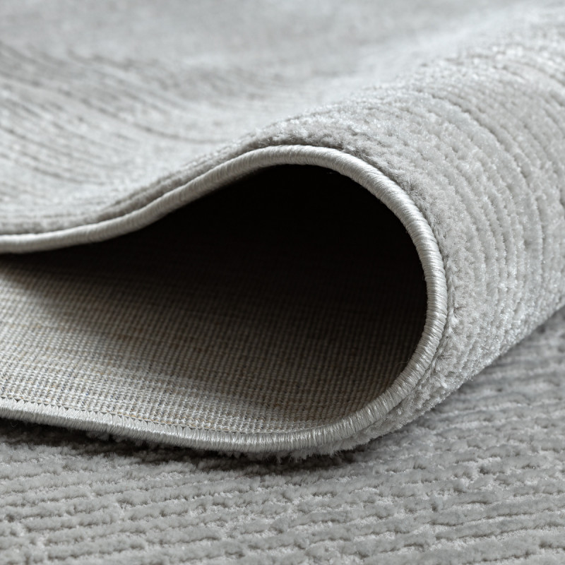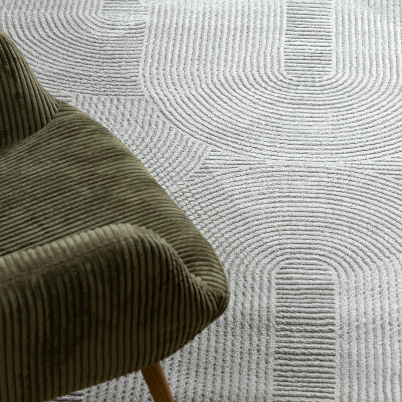 Stříbrný koberec s geometrickým motivem Vás na první pohled zaujme plastickým vzorem, který vytváří různě dlouhá vlákna. Jedná se o kousek vyrobený ze 100% polypropylenu, což je standardní materiál na výrobu koberců, který se vyznačuje odolností a snadnou údržbou.