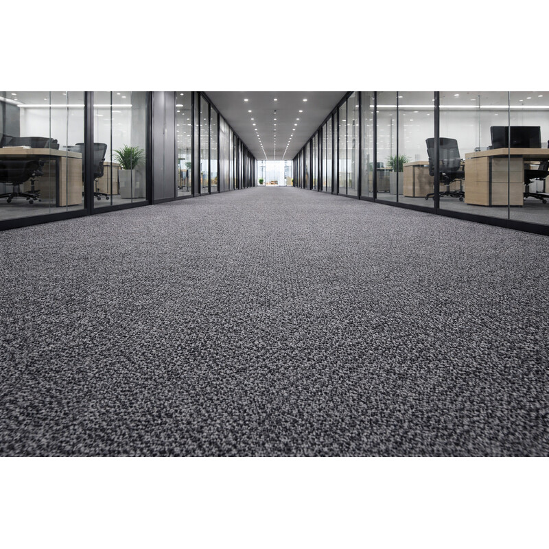 Tmavě šedý koberec v metráži můžete položit do místností i na silně zatížená schodiště. Díky krátkému smyčkovému vlasu z polyamidu je totiž velmi odolný. O tom vypovídá i fakt, že při pojezdu kolečkovou židlí není potřeba podložka, a to ani v případě tvrdých koleček. Koberec je vhodný i pro alergiky.