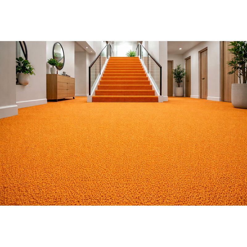 Oranžový metrážový koberec rozveselí každý interiér. Potěší Vás však nejen barvou, ale i mnoha praktickými vlastnostmi. Díky krátkému smyčkovému vlasu z polyamidu je odolný a snadný na údržbu. Dále je kompatibilní s podlahovým topením a kolečkovou židlí. Další výhody zajišťuje podložka na rubové straně, která tlumí hluk.