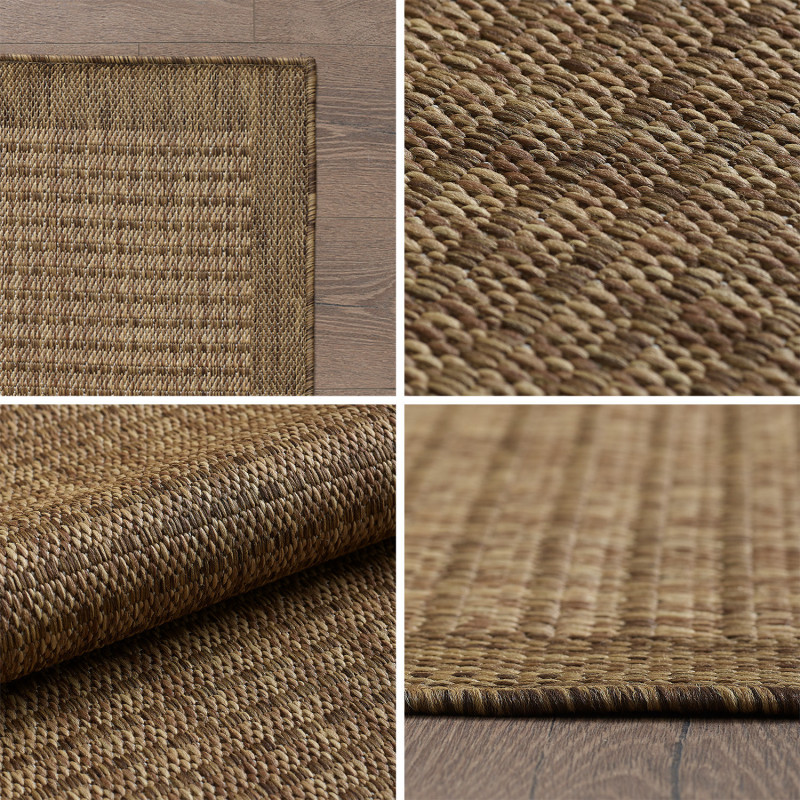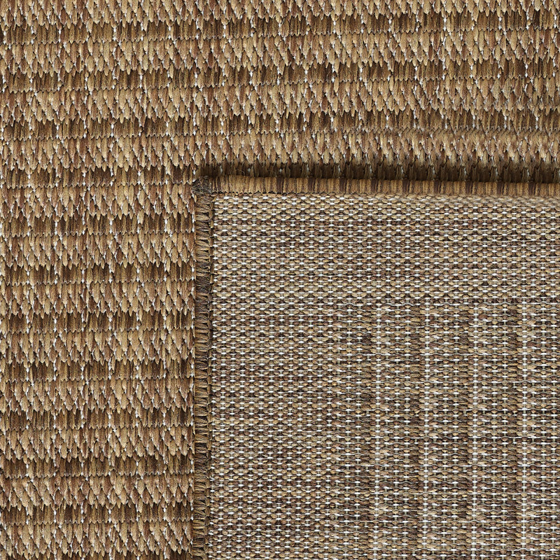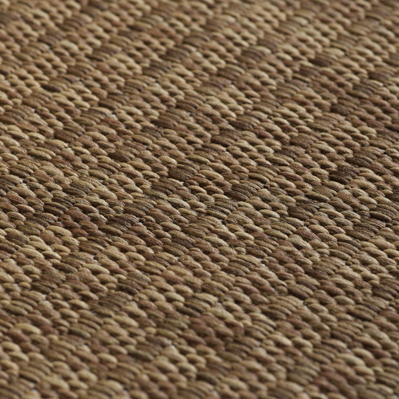 Béžový koberec, který křížem krážem protínají kosočtverce a na kratších stranách je lemován hnědými pruhy. Vyrábí se z polypropylenového vlákna a kombinací různě vysokého smyčkového vlasu vzniká poutavý 3D vzor. Koberec se vyznačuje odolností, a to i vůči povětrnostním vlivům, takže ho můžete položit i v exteriéru.