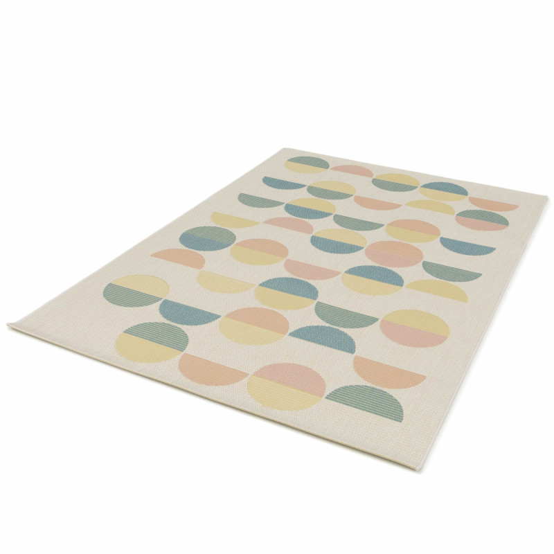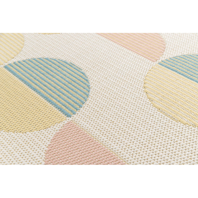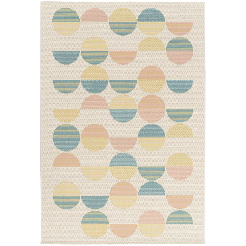 Poškození - vytržený vlas Koberec Star s geometrickým vzorem kruhů a půlkruhů v jemných pastelových barvách přináší do každého prostoru moderní eleganci a originalitu. Tento design dodá interiéru svěží a vzdušný nádech, zatímco díky své jednoduchosti a harmonickému barevnému ladění se snadno začlení do různých stylů. Koberec nemá klasický vlas, vlákna...