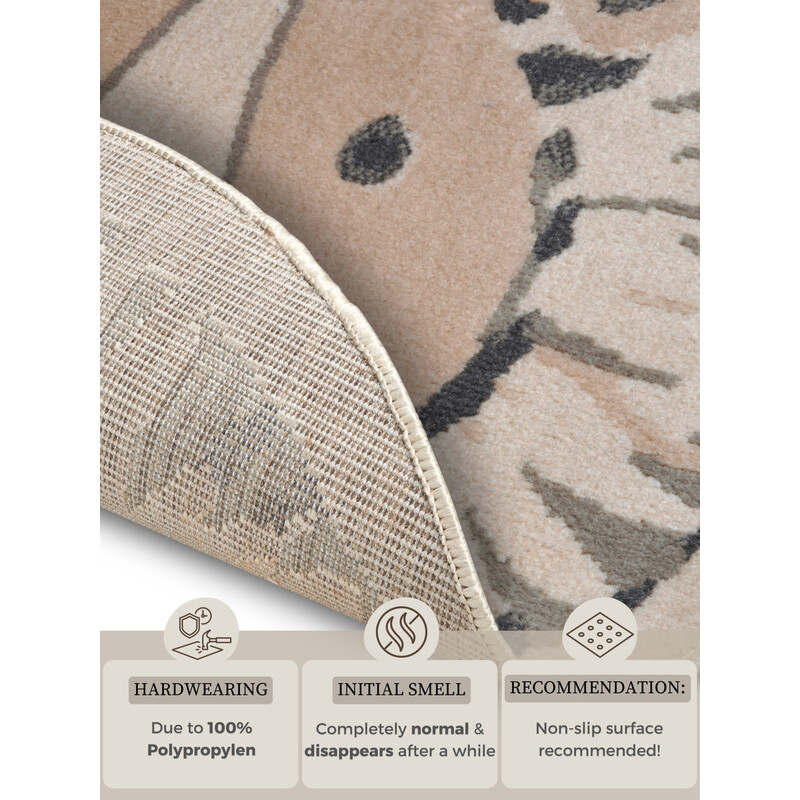 Béžový kruhový koberec s roztomilým lvíčkem přidá do dětského pokoje špetku kouzla. Je vyroben ze 100% polypropylenového vlákna, které zajišťuje odolnost a měkkost. Středně vysoký střižený vlas je pohodlný na dotek a obšití po obvodu prodlužuje životnost koberce. Další výhodou je snadná údržba – stačí použít šampón nebo kobercovou pěnu.