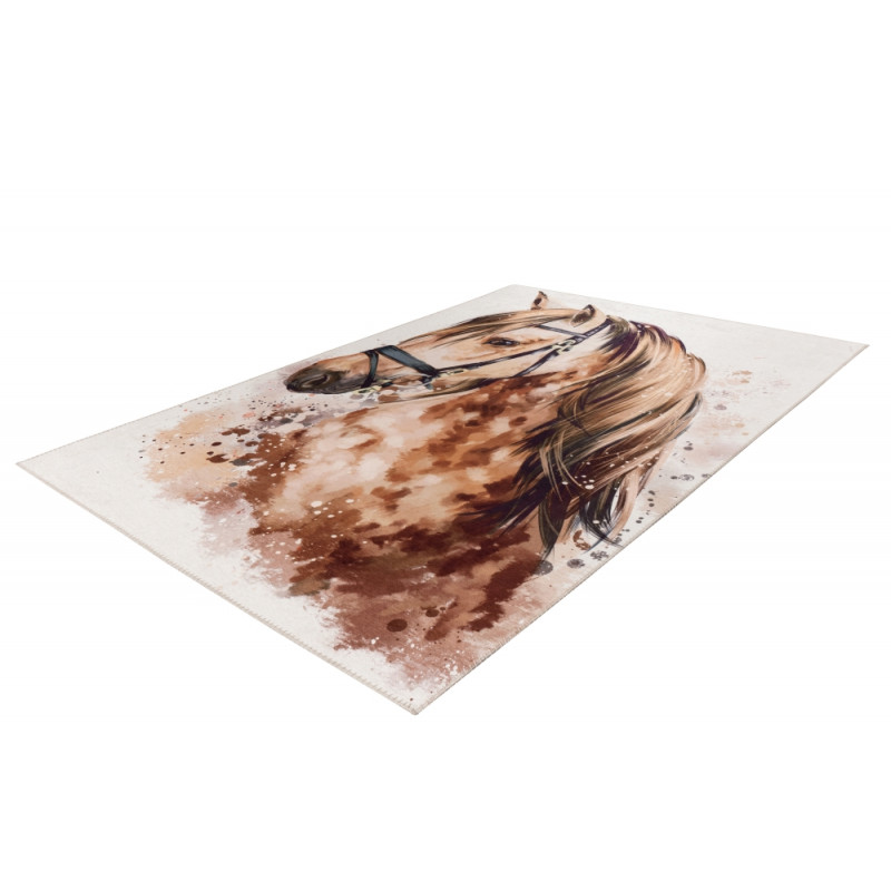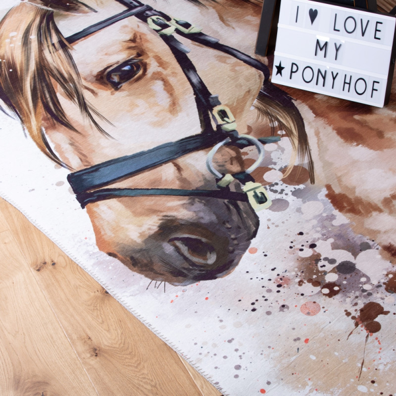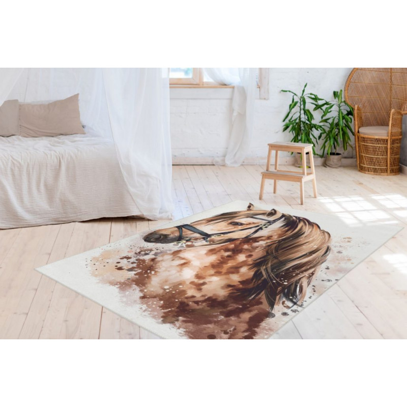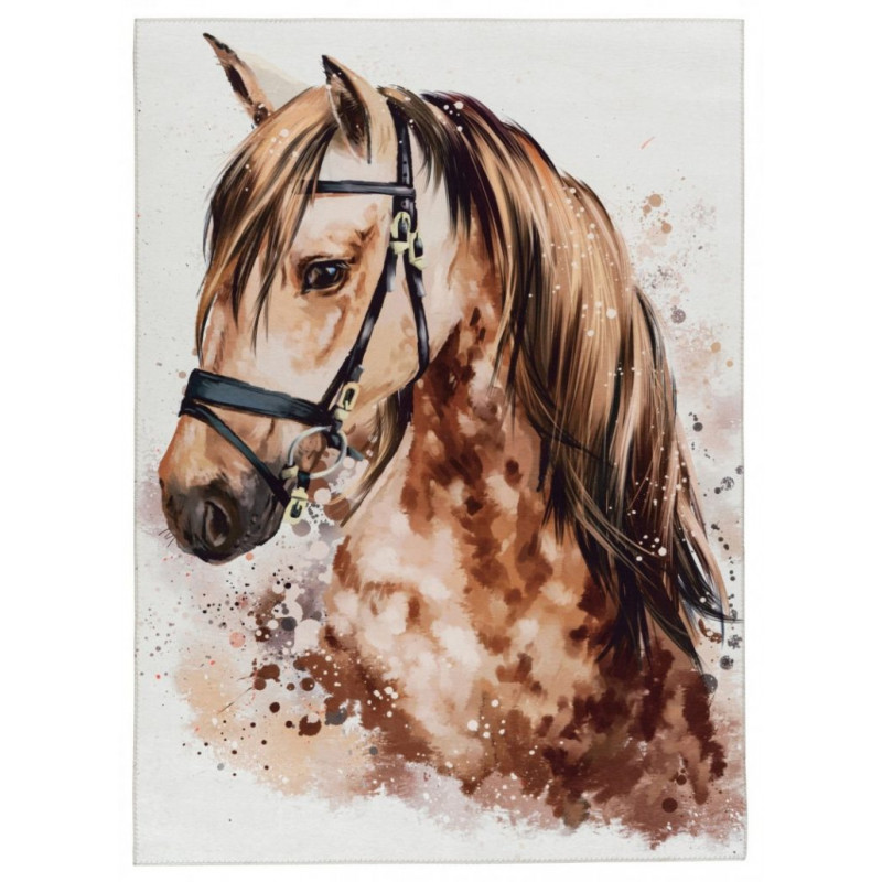 Dětský kusový koberec s krásným hnědým koněm ze 100% polyesterového vlákna se hodí jak do klučičích, tak i do dívčích dětských pokojů. Koberec má plochý vlas, takže se velmi snadno čistí, potěší antistatickou úpravou a zapomenout nesmíme ani na jednoduché lemování na všech stranách.