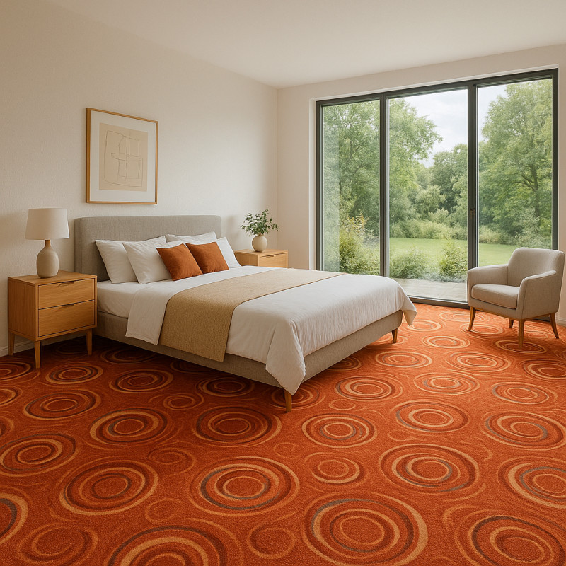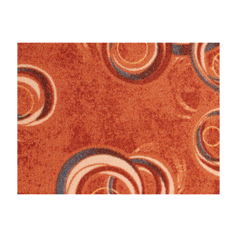 Veselý metrážový koberec z kolekce Drops je v hnědém odstínu, který se ovšem může jevit jako oranžový. Koberec je cenově velice přijatelný a hodí se do středně namáhaných obytných prostor. Zdobená je barevným potiskem v podobě kruhů. Díky parádní barvě dokonale projasní a rozzáří každý interiér. Navíc zaručuje stálobarevnost na slunci.