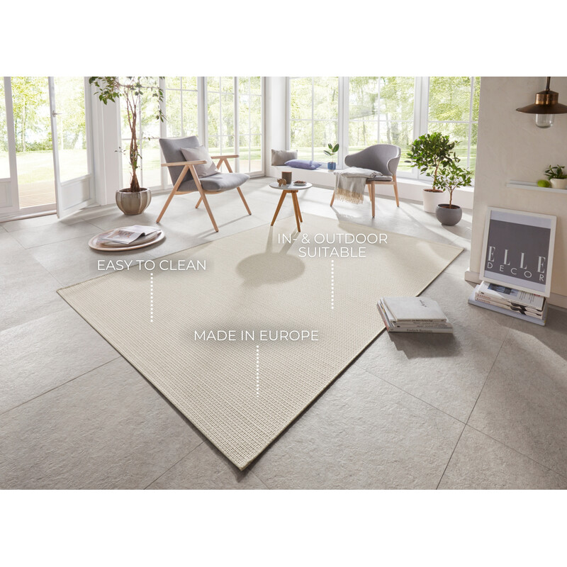 Kusový koberec Secret 103559 z kolekce Elle patří mezi cenově dostupné koberce, které mají i venkovní využití. Pro výrobu bylo zvoleno 100% polypropylenové vlákno, které je vysoce odolné a nenáročné na údržbu. Koberec nemá žádný vlas - patří mezi tzv. "Boucle". Designéři zvolili jednobarevný odstín krémové. Barva působí uklidňujícím dojmem.