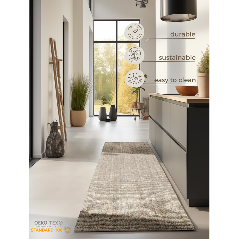 Světle béžový běhoun z juty přinese do vašeho interiéru jemnou a elegantní atmosféru. Jeho unikátní struktura bez klasického vlasu dodá prostoru moderní a zároveň přírodní vzhled. Díky své neutrální barvě snadno zapadne do různých místností, ať už do obývacího pokoje, ložnice nebo chodby.