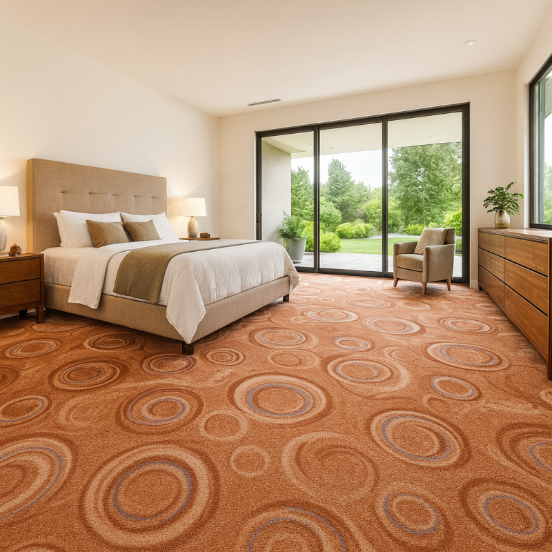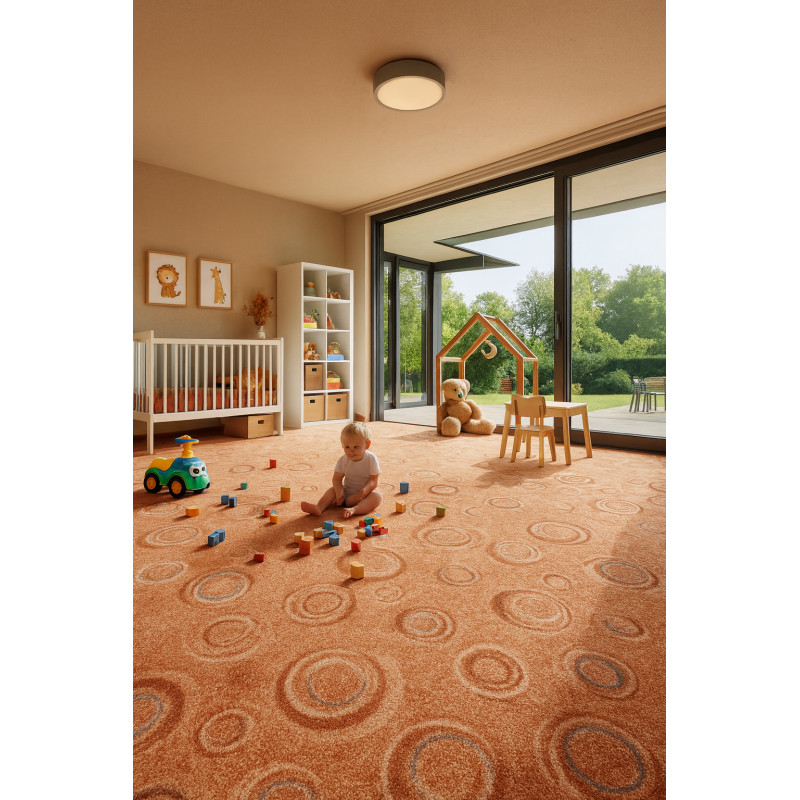 Krásný metrážový koberec v lehounké béžové barvě s barevnými potisky v podobě kruhů. Koberec je cenově velice přijatelný a hodí se především do středně namáhaných obytných místností. Díky své krásné světlé barvě projasní každý interiéru. Koberec se bude velmi dobře čistit a je možné ho použít na podlahové vytápění.