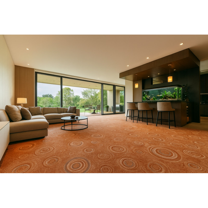Tmavě hnědý metrážový koberec vhodný do bytu, a to především do ložnice nebo obývacího pokoje. Je vyroben z pevného polypropylenu a má krátký smyčkový vlas. Díky těmto parametrům je odolný a snadný na údržbu. Dále je kompatibilní s kolečkovou židlí.