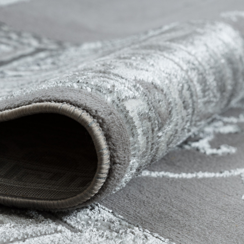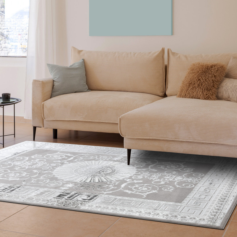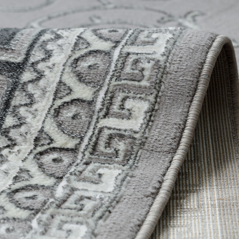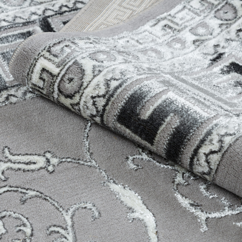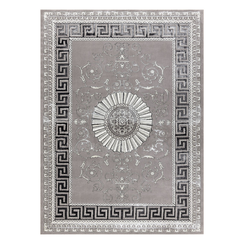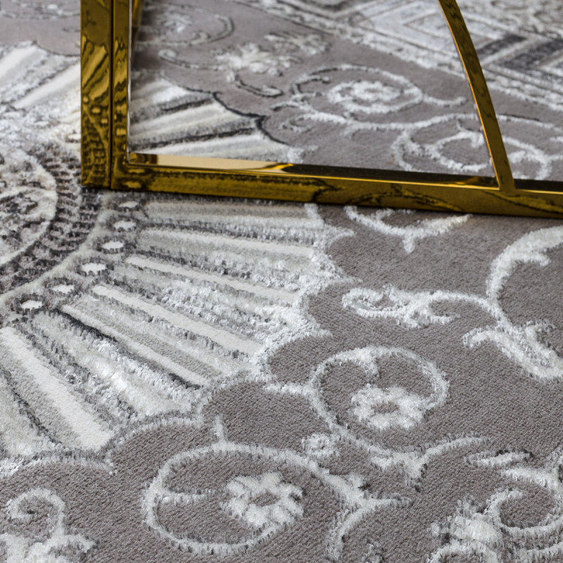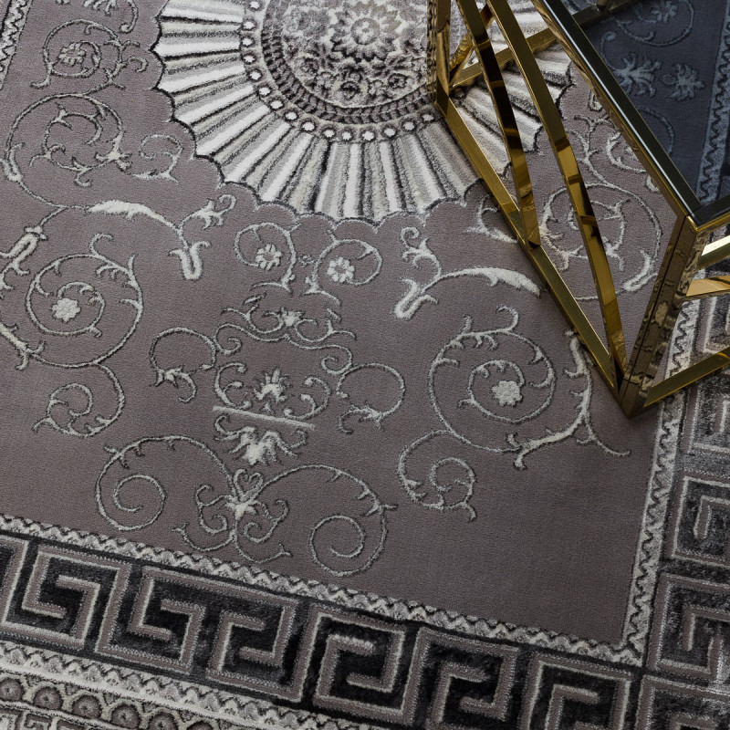 Koberec BLISS Z160AZ246 grey působí jako palácová dekorace přenesená do moderního interiéru. Dominantou je velkolepá rozeta uprostřed, obklopená bohatými ornamenty a rámovaná výrazným geometrickým lemem. Kombinace šedých a stříbrných tónů dodává koberci chladnou noblesu, díky níž působí majestátně, a přitom dokonale zapadne i do současného interiéru. Vlas...