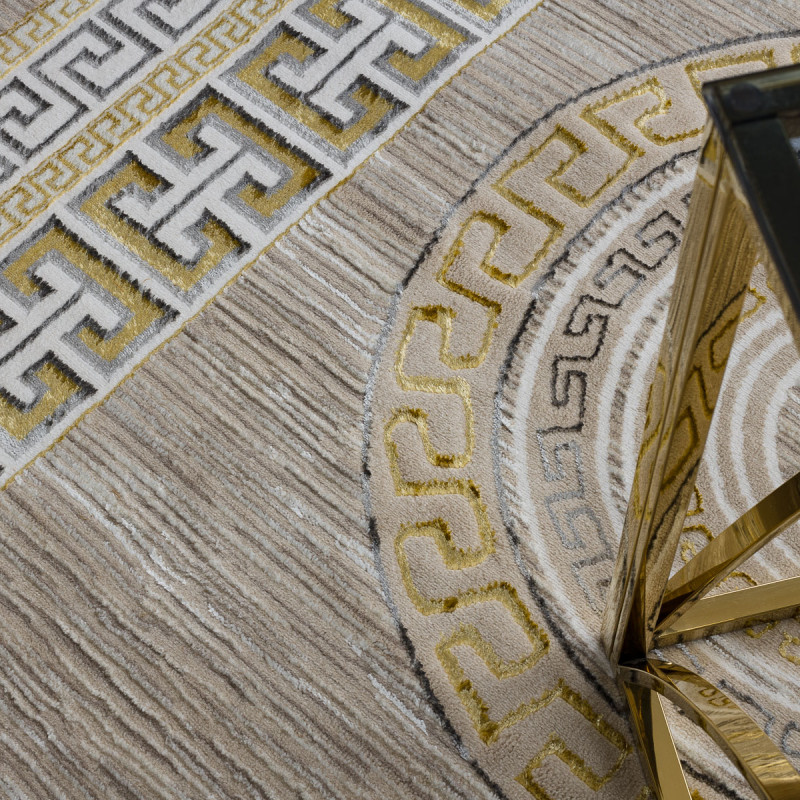 Kusový koberec Bliss Z205AZ127 cream/gold působí jako přenesený fragment antického chrámu. Jeho dominantou je kruhový motiv uprostřed, tvořený soustřednými geometrickými vzory, které se prolínají až k bohatému zlatavému lemu. Kombinace krémového podkladu a zlatých akcentů dodává koberci slavnostní nádech a luxusní atmosféru. Polyesterový vlas se jemně...