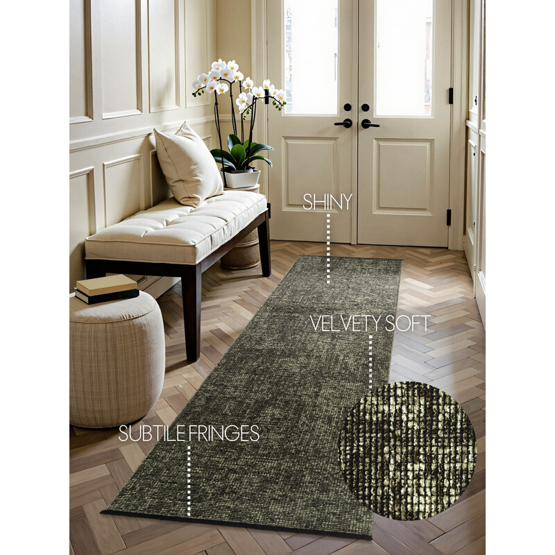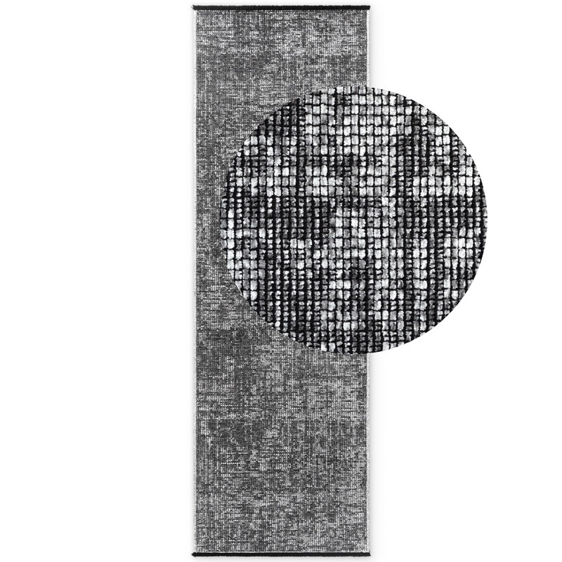 Šedo-stříbrný běhoun působí elegantně díky jemnému lesku, který se při dopadu světla proměňuje v decentní hru odstínů. Struktura s nízkým střiženým vlasem vytváří hladký, sofistikovaný povrch s motivem připomínajícím drobné mozaikové dlaždice. Kratší strany zdobí jemné třásně, zatímco delší jsou pečlivě obšité pro čistý a upravený vzhled. Materiál je...