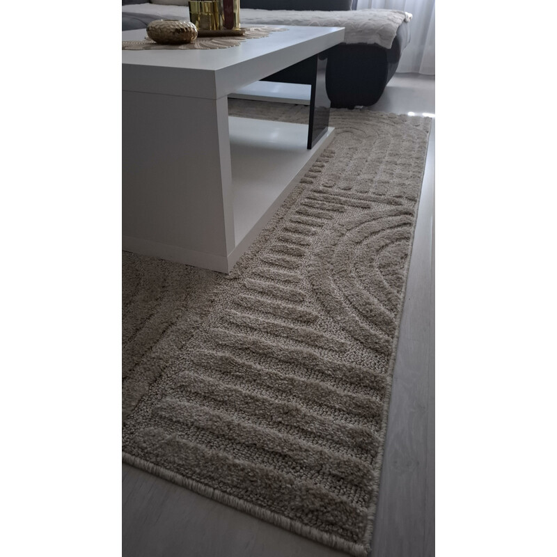 Béžový koberec s vystupujícími ornamenty, které vytvářejí poutavý 3D efekt. Smyčkový vlas z polypropylenového vlákna je velmi odolný a snadno udržitelný. Proto můžete koberec bez obav položit nejen v obývacím pokoji či chodbě, ale také na terase.