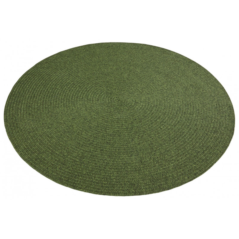 Zelený kruhový koberec, který barevně připomíná trávu a dokonce ho můžete položit ven. Lépe řečeno na terasu nebo balkon. Je totiž odolný vůči povětrnostním vlivům a snadno udržitelný. Má pevné středně vysoké smyčky z polypropylenového vlákna, antistatickou úpravu, a díky melírování skryje drobné nečistoty.