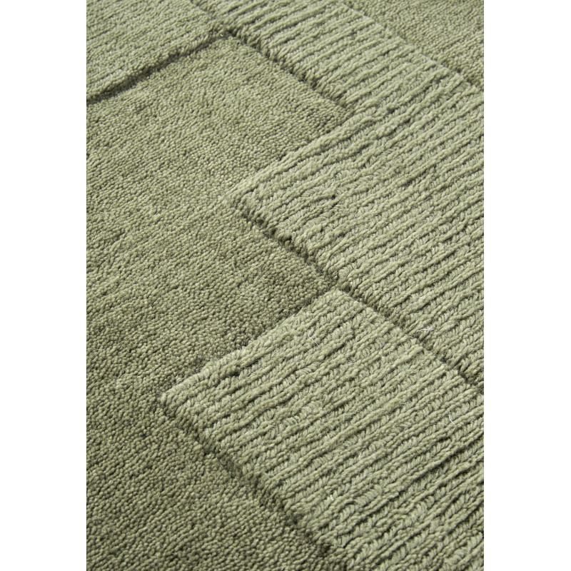 Olivově zelený koberec zaujme svým geometrickým 3D vzorem, který přidá každému interiéru jedinečný umělecký prvek. Je ručně tkaný metodou hand-loom, a proto vykazuje pečlivé zpracování a vysokou kvalitu. Jeho středně vysoký střižený vlas z vlny nejen dobře izoluje chlad, ale je také ideální pro podlahové vytápění, což zajišťuje maximální pohodlí.