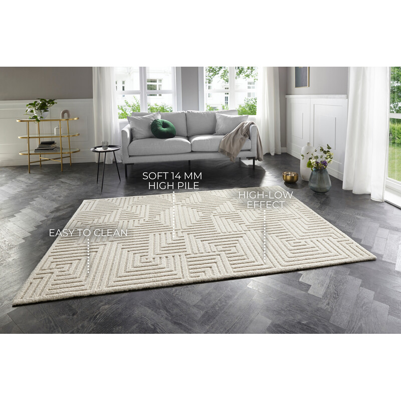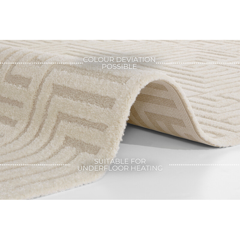 Krémový koberec se zajímavým motivem, který připomíná bludiště. Zejména z profilu lze pozorovat, že geometrický motiv je podpořen 3D efektem. Tento krasavec je vyroben z pevného polypropylenu a hebkého polyesteru. Proto je odolný a velmi příjemný na dotek. Bude mu to slušet v každé domácnosti.