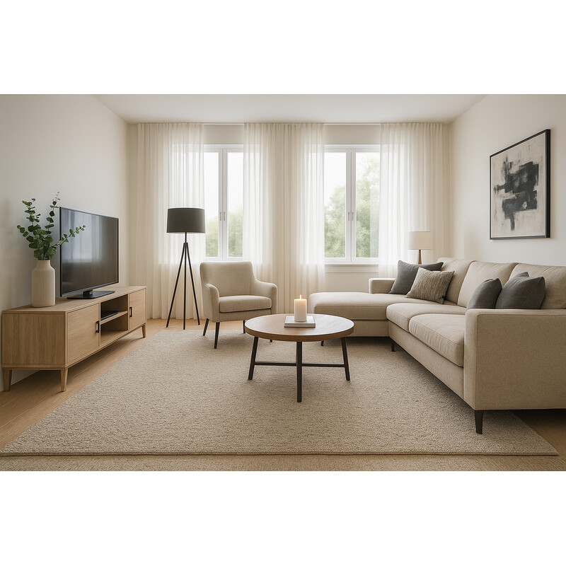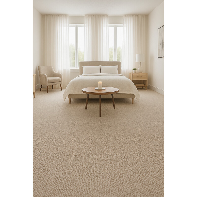 Béžový vlněný metrážový koberec, který má řadu nesporných výhod. Například perfektně izoluje chlad, tlumí kročejový hluk a pohlcuje prach. To vše zajišťuje vlna jakožto přírodní izolant. Středně vysoký smyčkový vlas je odolný a snadno udržitelný. Koberec má protiskluzovou podložku actionback ze syntetické juty a je kompatibilní s podlahovým topením.