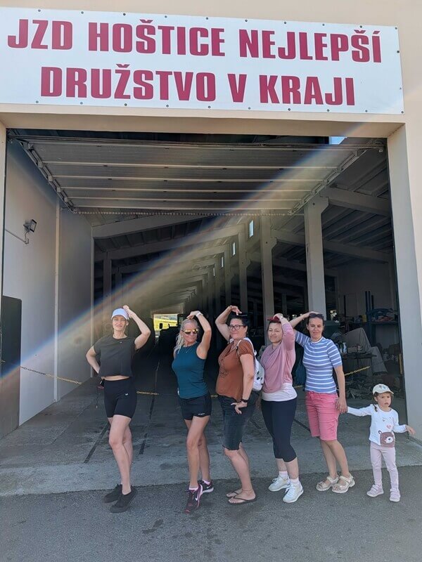 Pak jsme se vydali do Hoštic – legendární vesnice, kde se natáčelo Slunce, seno…. Holky se tam frajersky vyfotily u slavného JZD, a jako bonus jsme ještě potkali Milunu, která zrovna myla okna. Nostalgie jak hrom!