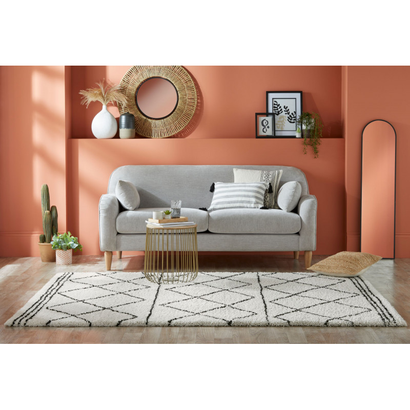 Krémový koberec protkaný černými liniemi a obrysy kosočtverců ozdobí a prosvětlí každý interiér. Vyrábí se ze 100% polypropylenu, což je odolný materiál. Má vysoký vlas typu shaggy, který je velmi komfortní na došlap a zároveň snadný na údržbu. Můžete použít vysavač bez rotačního kartáče - mohl by huňatý vlas poškodit.