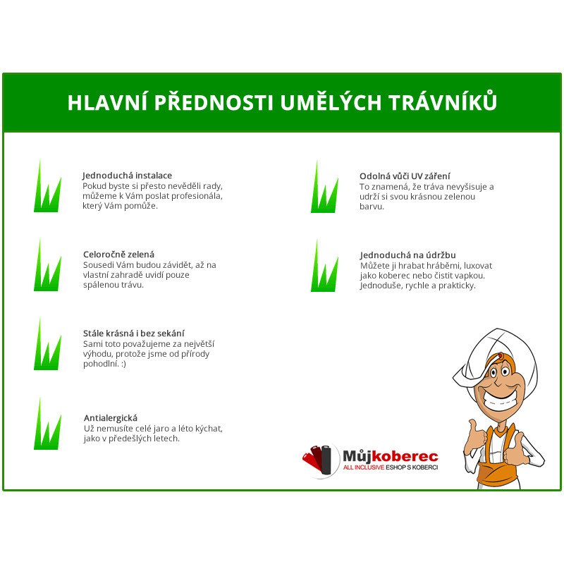 Umělá tráva je skvělou volbou nejen pro ty, kteří mají rádi stébla trávy srovnaná na značkách, pěkně vztyčená a perfektně zastřižená. Umělý trávník je senzačním řešením i pro alergiky nebo ty, kteří nechtějí údržbě věnovat příliš času, ale přesto si potrpí na anglickém trávníku. Možnosti využití jsou neomezené, protože umělá tráva se hodí nejen na zahradu nebo terasu, balkón ale také pod bazén, trampolínu či dětské hřiště.