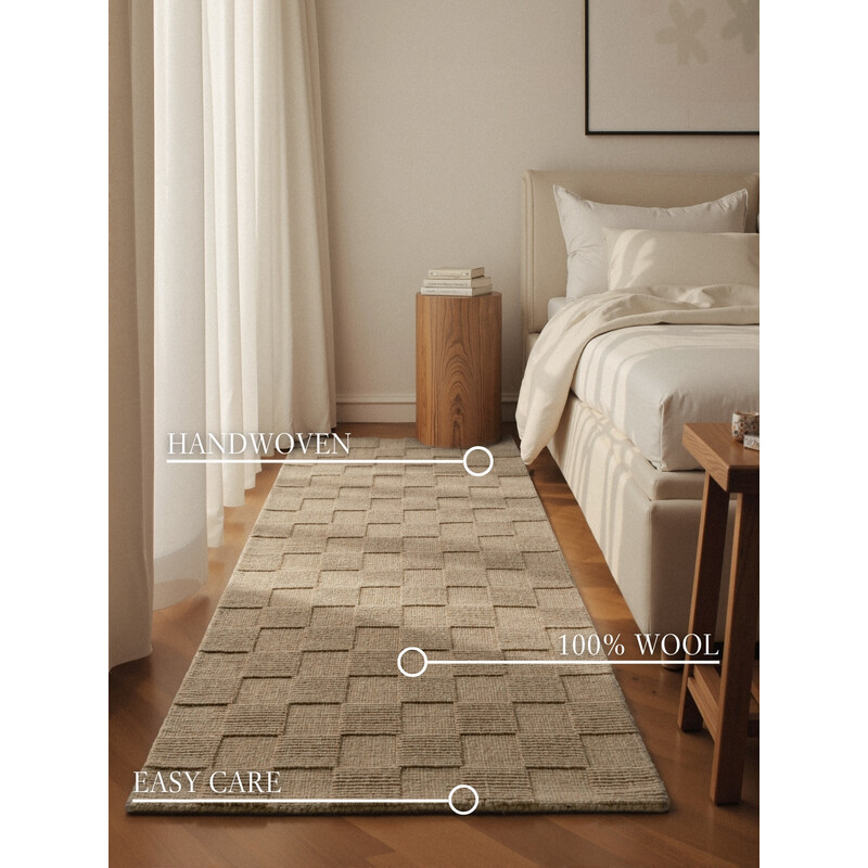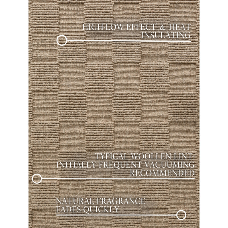 Vlna je přírodní materiál, který se získává z ovčí srsti. Má řadu vlastností, které ji činí vhodnou pro výrobu koberců. Tento koberec je teplý, měkký, odolný, pružný a snadno se čistí. Také dobře izoluje zvuk a teplo a má antibakteriální účinky. Jedná se o prémiový kousek, protože vlna dokáže regulovat mikroklima – když je v místnosti příliš vlhko, vlhkost nasaje do sebe a pak ji postupně uvolňuje. Krátce po rozbalení může mít koberec tendenci mírně pouštět vlas, což je u vlny normální a trvá to pár dní, maximálně týdnů (v závislosti na intenzitě používání).